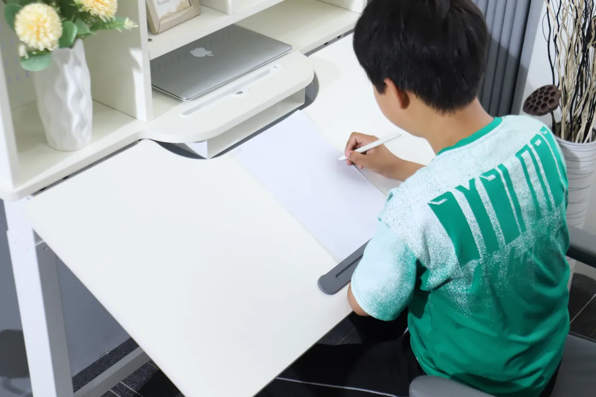Electronic Height Adjustable Study Desk with Shelving has partitioned storage to develop good organisational habits. It has two-dimensional lifting which enhances efficient learning. The height and angle adjustments meet different learning requirements that one may have.