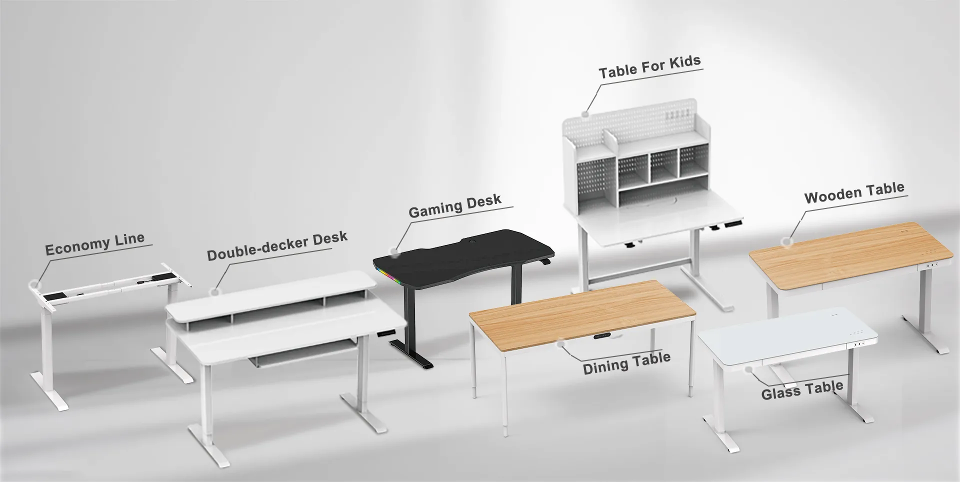 The Economyline collection offers budget-friendly height-adjustable desks in various types - from versatile home office desks and space-saving double-deckers to gamer-focused, kids-oriented, elegant glass, and classic wooden options, all designed for functionality and affordability.